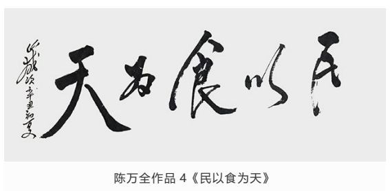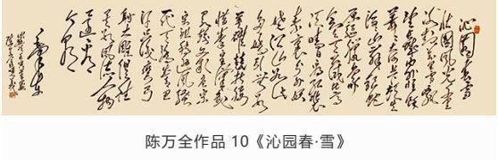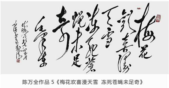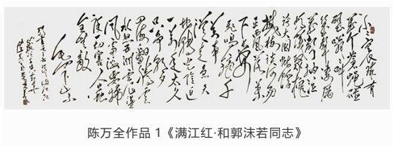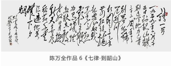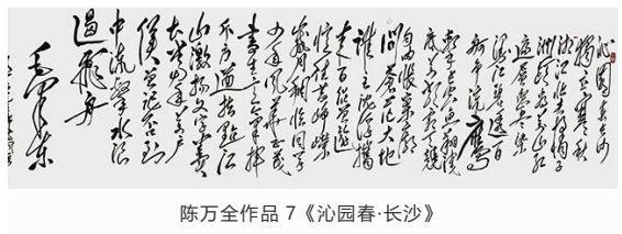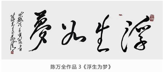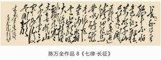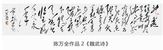 观陈万全先生作品,师于“毛韵”却自出一格,或豪迈、或委婉、或奔放,时如风雨雷电、又似水流花开,有悠悠天地肝胆照、大泽龙蛇腾云起之气势。在墨饱酣畅间更显力透纸背的功底。写字比画画难!古语云:十年学写字,三年学画画。画画有很多色彩,形象,参照物,光线,距离等许多元素,而写字只有笔划和文字之间的关联。字由心生,现端于笔。在长期的实践中,陈万全先生以自我性情溶于笔墨驾驭。结字隽永,章法谨严,排列布局疏密有致,错落相谐,刚柔并济、浑然一体,观者能充分感受到绵绵无止的字韵“筋脉”之通贯。在感受陈先生之笔精墨妙的同时,亦祝愿他在中国书坛获得更为辉煌的成就。