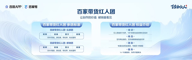 随着内容电商步入“精耕细作”阶段,百家号达人内容带货业务已成长为连接达人、消费者与品牌方的核心桥梁。在此背景下,为助力更多达人与机构实现快速起量、长效盈利,百度百家号推出“百家带货红人团”计划,以“培训孵化、商品撮合、激励扶持、专属服务”四大核心赋能构建全周期支持体系,推动“优质内容吸引用户、用户反哺商业”的正向循环,提升达人及MCN的变现效率,打造达人内容带货标杆,引领行业生态共荣。