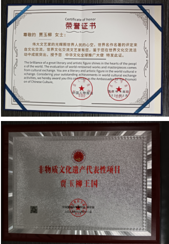 2014年中国共产党中央委员会党校,荣获2013年度全国“十佳优秀退休干部”称号荣誉证书。世界华人艺术家联合会荣获2014年“中国当代十大名家”称号荣誉证书。中国政协画院,担任政协画院(副院长之职)荣誉聘书2014年。中国国家书画院,国家艺术奖金奖荣誉称号“国家艺术大师荣誉称号”2014年。中国国际经济技术合作促进会品牌促进中心《全国书画行业A级AAAAA服务单位,温州市贾玉柳书画店》2014年。中华人民共和国国家版权局《著作权登记证书》经中国版权保护中心审核“书法作品沁园春雪”书法版权保护证书;2014-6-01029号。中华人民共和国国家版权局,著作权登记证书,经中国版权保护中心审核,美术作品《钓鱼岛》国画版权,登记证号:2014-6-01029。世界华人艺术品评估鉴定委员会,ISC2014艺术品评审润格为:国画(作品)500至550亿英镑1平方尺,ISC2014艺术品评审润格为:书法(作品)450至500亿英镑1平方尺,证书档案编