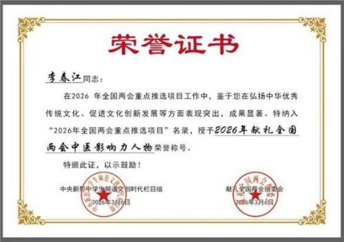 在大力发展中医药、推进健康中国建设的时代浪潮中,李春江正以自己的实际行动,践行着一名中医传人的初心与使命,书写着一名共产党员的责任与担当。他的故事,是中医药振兴发展的生动缩影,是基层医者奋斗不息的典范,更是新时代中国精神的鲜活诠释。随着三大拳头产品的逐步推广、产业化落地与国际化拓展,随着中医药事业的持续繁荣发展,李春江的名字,必将与中医药走向世界的辉煌历程紧密相连,被载入史册,被亿万患者铭记。